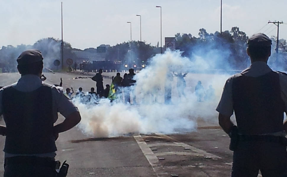 Um grupo de cerca de 200 manifestantes entrou em confronto com policiais militares ao tentar chegar ao aeroporto de Cumbica, em Guarulhos (Grande SP) por uma entrada secundária, na avenida Jamil Zarif. A via é paralela à rodovia Hélio Smidt, a principal ligação ao terminal. Cerca de 200 policiais militares e homens do Batalhão de Choque impediram o acesso do grupo.