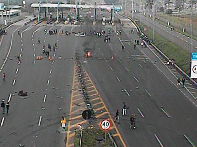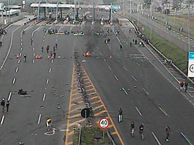 Uma das sete cabines da praça de pedágio teve o vidro quebrado, pelo menos seis radares e cinco painéis de informação foram depredados e uma cadeira, cones e barreiras plásticas foram queimadas.