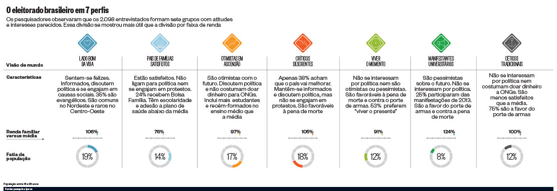 Por isso, os pesquisadores preferiram agrupar as respostas de acordo com sete perfis de comportamento: “lado bom da vida”, “pais de família satisfeitos”, “otimistas em ascensão”, “críticos descontentes”, “viver o momento”, “manifestantes universitários” e “céticos tradicionais” (leia mais sobre cada grupo nos quadros). “Classificar a sociedade em classes como A, B, C e D é cada vez menos eficaz para formular políticas públicas”, diz Patricia Ellen, do McKinsey Global Institute, uma entidade participante do estudo. “A sociedade não se organiza em torno da faixa de renda ou localidade, e sim em torno de causas e visões de mundo.” O estudo foi apresentado aos principais candidatos a presidente. Eles fariam bem em separar algum tempo para essa leitura instrutiva.