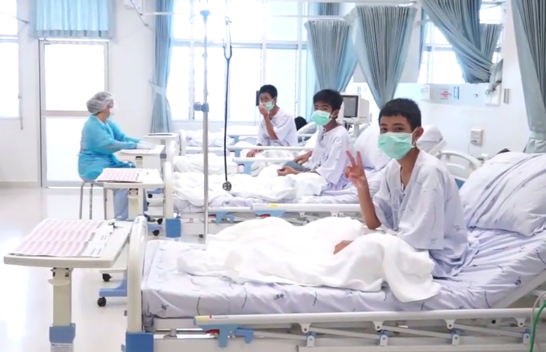 Os doze meninos de um time de futebol e seu técnico se recuperam em um hospital de Chiang Rai, na Tailândia, após ficarem mais de duas semanas presos em uma caverna. Nesta quarta-feira (11) o governo local divulgou as primeiras imagens do grupo na unidade saúde, onde estão sendo tratados.Nos registros, que fazem parte de um vídeo, é possível ver alguns garotos acenando para a câmera. Veja nas fotos a seguir mais imagens do grupo no hospital e como foi o resgate